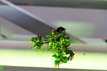 Moscow, Russia May 13, 2020: Plants in a vertical growing system with LED lights.