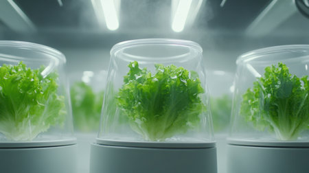 Hydroponic lettuce thriving in clear containers, showcasing innovative indoor farming methods under bright lights.