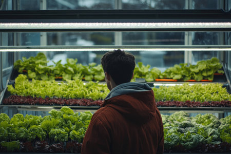 Young man in a hoodie admiring fresh lettuce in a greenhouse, showcasing healthy eating and sustainability with vibrant greens