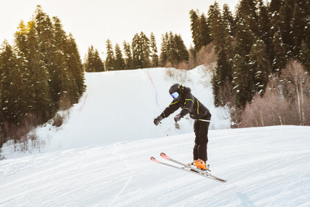 Close up skier wear black outfit ski fast on slope downhill in winter ski resort. Sports wear, fun in Gudauri ski resort in Georgia. Caucasus winter holidays.