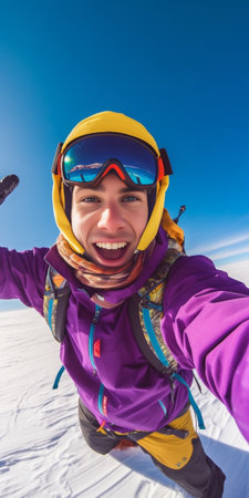 A Skiers enjoying sunny day on snowy mountain, capturing joyful selfie