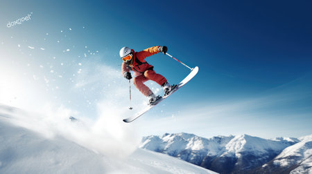 Skier performing aerial jump trick mid air on snowy mountain slope during winter holiday adventure in alpine ski resort under clear blue sky
