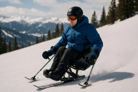 Skier using adaptive equipment descends a snowy mountain slope, demonstrating freedom and inclusion in winter sports