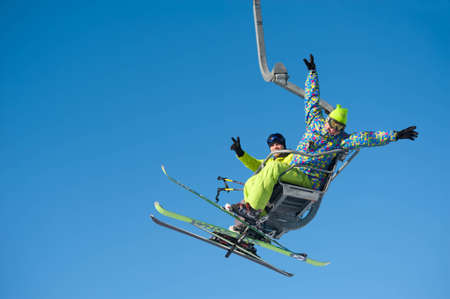 Bottom view of skiers have a fun on chair lift in the sky and steel cable