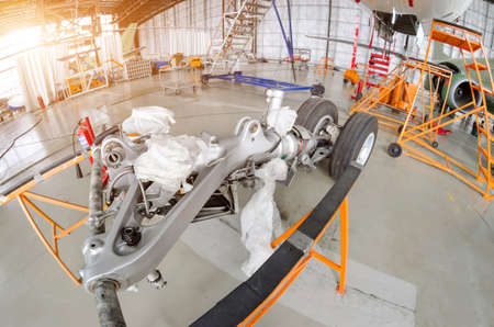 Replacement of the front landing gear at the passenger liner in the hangar, dismantled landing gear