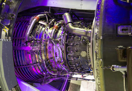 plane turbine engine mechanism closeup. violet illumination