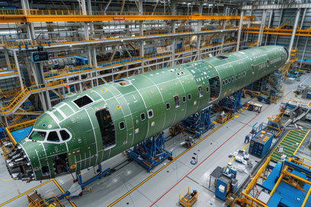 Precision Engineering in Aerospace Manufacturing Facility Showcasing Aircraft Fuselage Assembly and Detailed Craftsmanship Generative AI