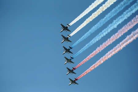 MOSCOW, RUSSIA - June 24, 2020: Victory Parade -75. Red Square. Aerial show in sky. Air parade Russian aviation. Su-25 in sky forces Russian tricolor smoke flag during military parade on Victory Day