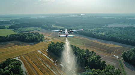 An agricultural aircraft plane watering a field during the daytime. Ai generative