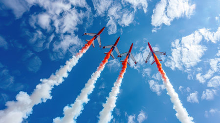 Vibrant smoke trails from airplanes create a stunning aerial display against a clear blue sky. This captivating scene showcases the artistry of flight.