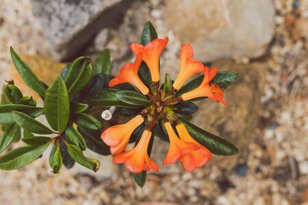 close-up of vireya rhododendron plant with orange flowers outdoor in sunny backyard