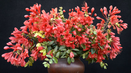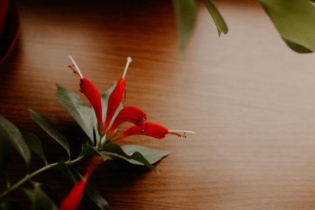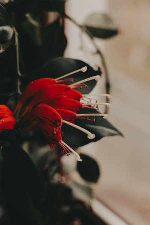 A striking lipstick plant, its vivid red flowers contrasting beautifully with the dark green foliage on a brown wooden background. The soft lighting adds a touch of elegance Houseplant in home garden.