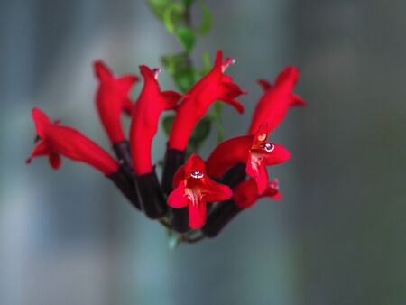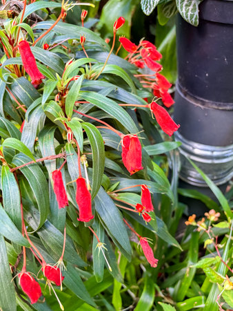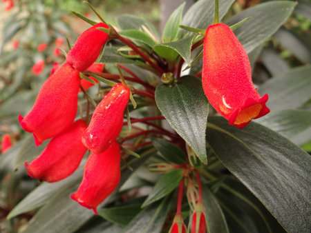 A close up shot of bright red Coleria flowers growing in the garden