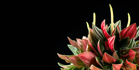 Peperomia Caperata Rosso plant isolated on black background. Growing plant in a pot close up. Beautiful houseplant, for interior design, macro shot