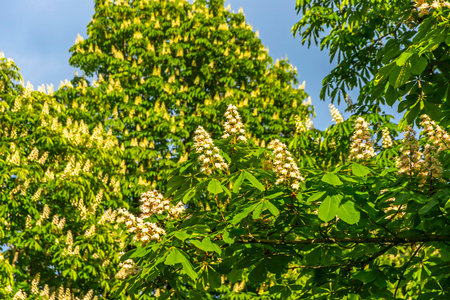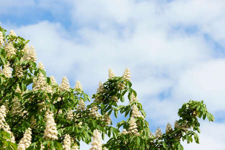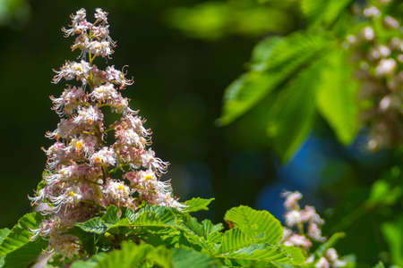 Bright flowers blooming chestnut in sunny day.