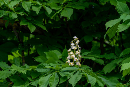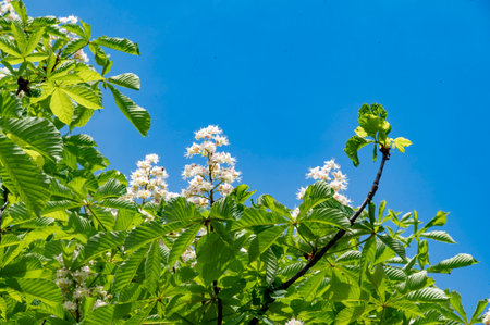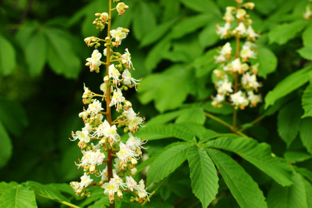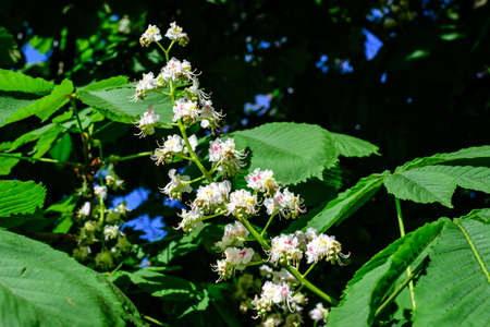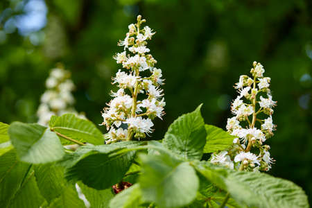 Aesculus hippocastanum horse chestnut tree in bloom, group of white flowering flowers and green leaves on branches