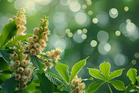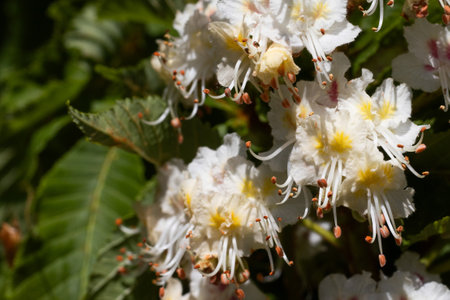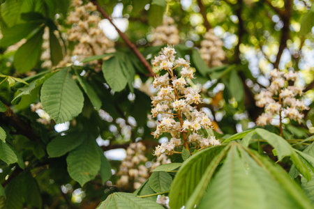 Delicate white chestnut flowers unfold under the warm sun, surrounded by lush green leaves. The blossoms exude a vibrant atmosphere of spring, attracting pollinators to their enchanting aura.