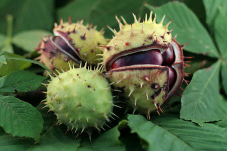 ripe prickly chestnuts and leaves, nature background