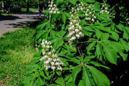 Spring background. Blossoming white chestnut tree (Aesculus hippocastanum) in the city park.