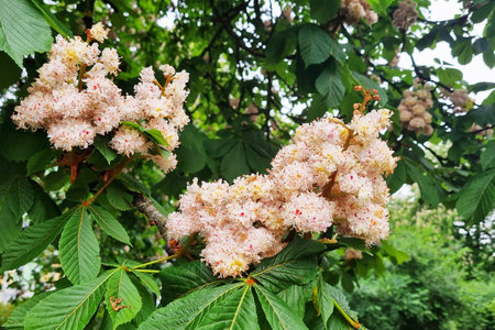 Vibrant clusters of blooming chestnut tree flowers in a lush spring garden. delicate white and pink blossoms contrast with the rich green foliage. perfect for nature photography enthusiasts seeking serene and natural scenes for prints and posters.