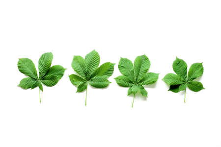 Chestnut leaves lie in a row isolated on a white background. Summer mockup with green leaves. Top view with copy space.
