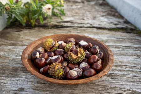 Chestnuts in a wooden bowl on a wooden background. Autumn harvest.