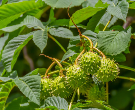 Chestnut tree with young chestnut fruits in a shell with spines. macro photography.