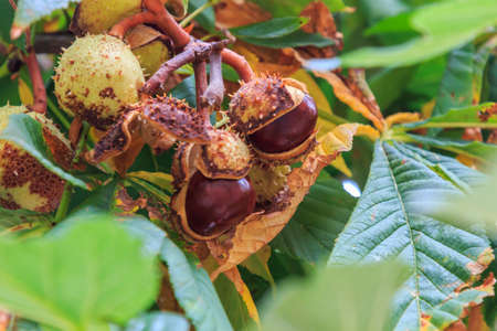 Chestnut fruit coming out of the shell hanging on the tree and unfocused background. Seasonal fruit concept