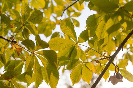 Chestnut tree twig, colorful autumn leaves, fall season, selective focus. Natural background