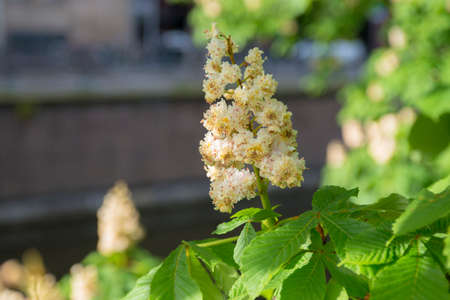 photographed close up bright flowers of chestnut in the spring season, defocused