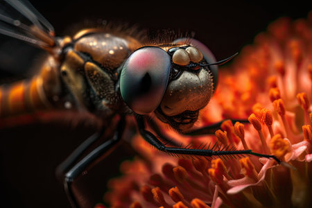 A macro shot of a dragonfly with delicate transparent wings on a flower. Generative AI illustration