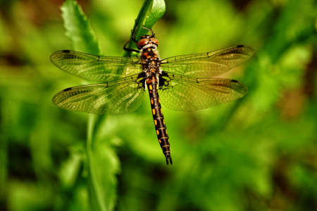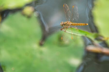 close up of beautiful dragonfly on a green plant, take photos in the wild natural state, china.