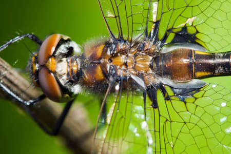 Macro shot of dragonfly wing detail. Dragonfly background.