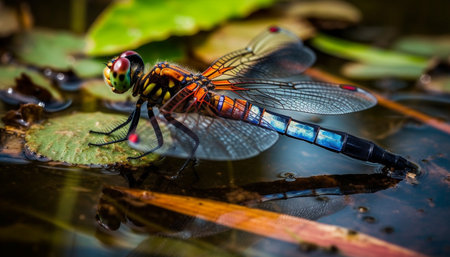 Vibrant dragonfly rests on wet leaf in green pond generated by artificial intelligence