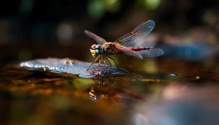 Vibrant dragonfly resting on wet leaf, reflecting beauty in nature generated by artificial intelligence