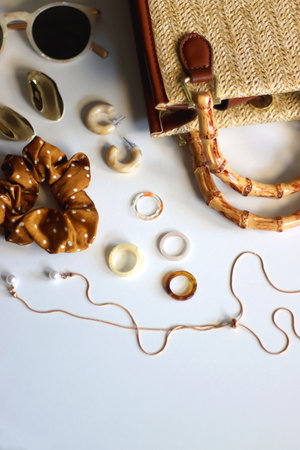 Wicker purse, sunglasses, scrunchie, lipstick and various gold and neutral jewelry on white background. Selective focus.