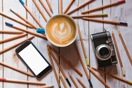 Flat lay of vintage camera, coffee cup and smartphone on white background