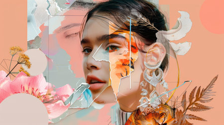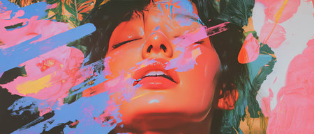 A striking portrait of a woman is set against an engaging backdrop of bold colors and abstract shapes. The artwork combines modern elements with vibrant details.