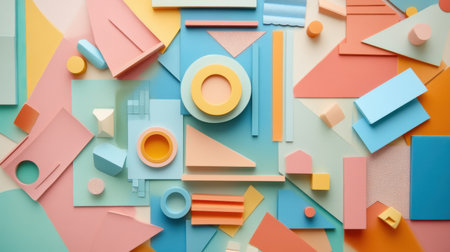 Explore a vibrant arrangement of geometric shapes in soft pastel colors, perfect for creative backgrounds, design inspiration, or artistic projects.