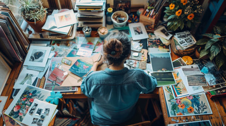 creative workspace photographer sorting vintage pictures