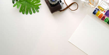 Top view of comfortable artist workplace with sketch paper and painting tools on white table background