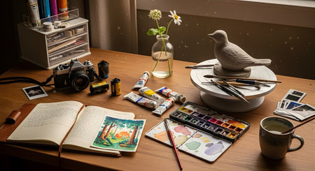 A neatly arranged flat lay of a creative workspace featuring a variety of art supplies, including watercolors, paint tubes, a sketchbook, and brushes. The desk also has a film camera, a small bird sculpture, and a vase, suggesting hobbies like art, photography, and craftsmanship.