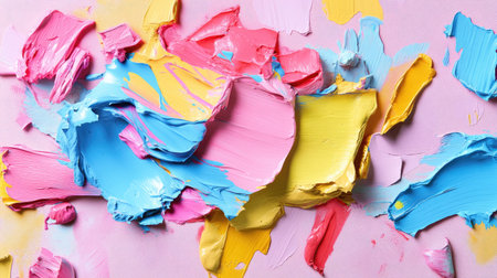 Explore this vibrant and colorful abstract composition featuring lively paint strokes in shades of pink, blue, yellow, and orange on a soft pink background.