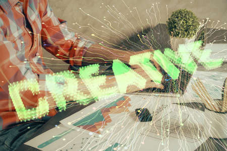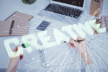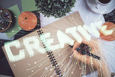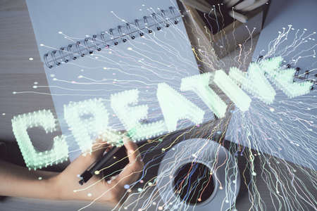 Start up creative drawing over close up hands in notepad background. Concept of brainstorming. Double exposure