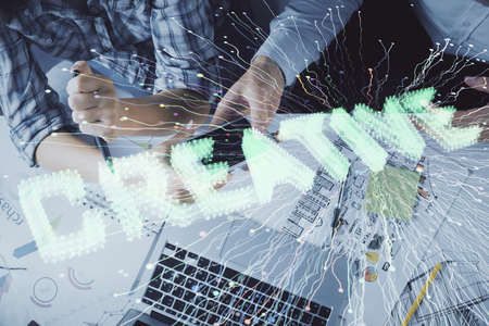 Double exposure of creative hologram drawing and man and woman working together holding and using a mobile device.
