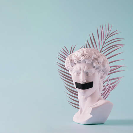 Pure white antique style Grecian or Roman bust with fronds with a taped mouth over blue in a conceptual image with copy space in square format