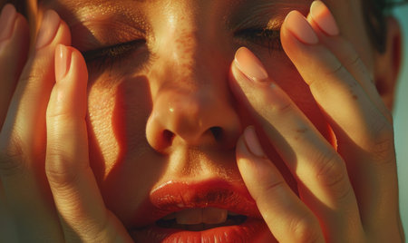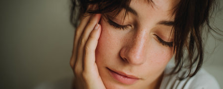 Close up face woman eyes closed hand natural light peaceful calm skin portrait