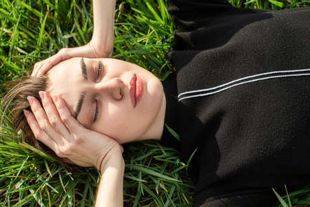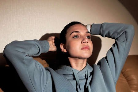 Portrait of a cute brunette woman holding hands behind her head. Close up