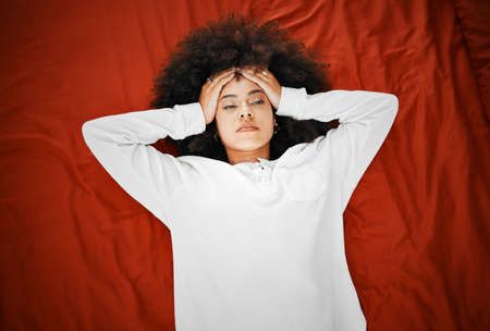 Woman with headache, mental health depression and anxiety thinking about life failure, crisis and stress on red background. Above of dizzy pain, tired and sick with trauma, problem and panic attack