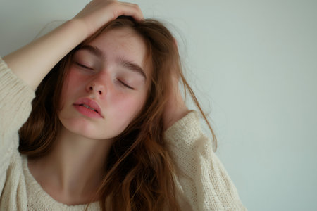 A young individual sits quietly with eyes closed, hands resting thoughtfully on their head, reflecting feelings of stress and anxiety.